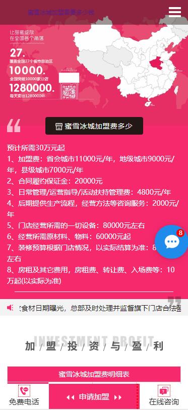 蜜雪冰城加盟费省会城市11000元/年,地级城市9000元/年,县级城市7000元/年。设备、首批原料费用、房租及装修费用大概需要28.68万元起